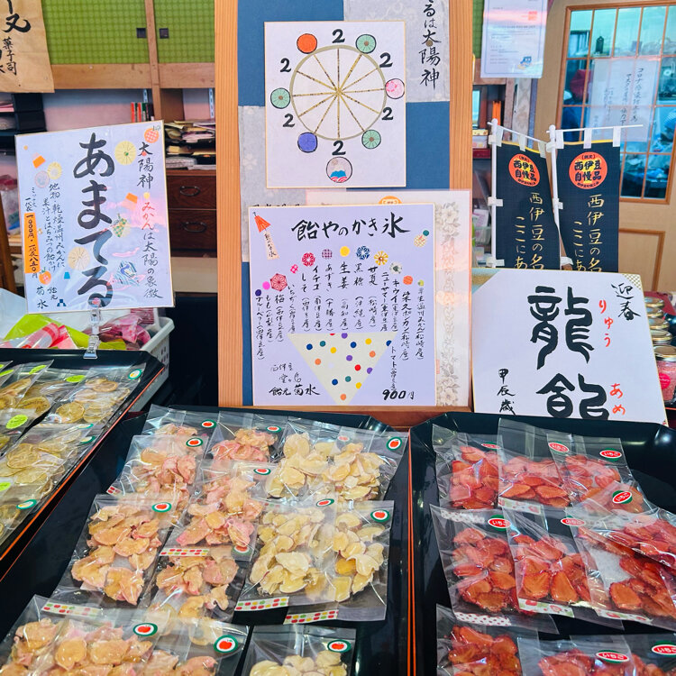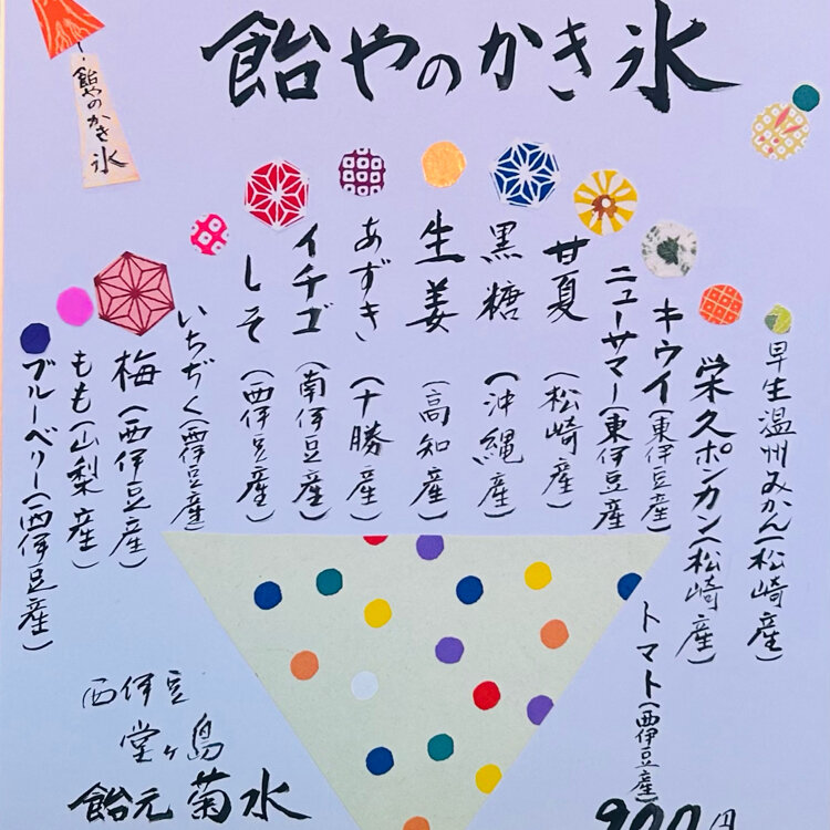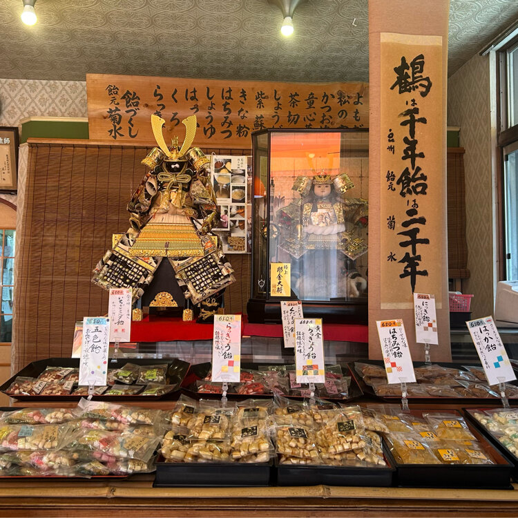 手作りの味にこだわり続ける老舗菓子店。ラッキョウやカツオ節など、珍しい味の飴や和菓子がずらりと並ぶ。飴を使った夏限定の「飴やのかき氷」は、菊水ならではの味わいだ。