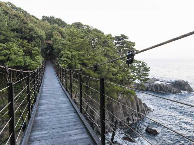 海に流れ込んだ溶岩が急に冷やされてできた、柱状の「橋立」とその対岸に架かる。全長60m、高さ18mの橋のたもとには水原秋桜子の句碑もある。城ヶ崎自然研究路の一角だ。