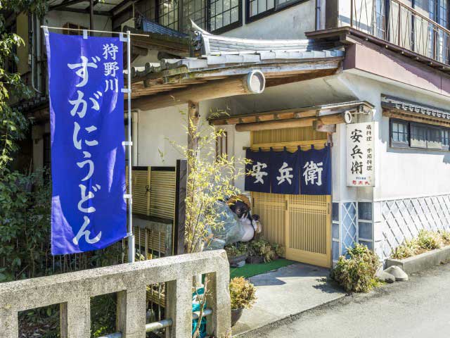 春は山菜、夏は鮎と、四季折々の伊豆の幸を楽しませてくれる和食処。名物メニューは、狩野川で獲れるズガニを使ったうどん。生け簀で1年分を確保しているので漁期外でも味わえる。