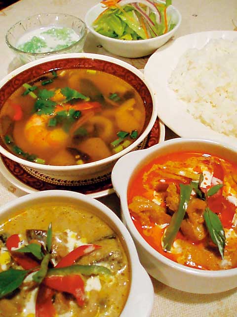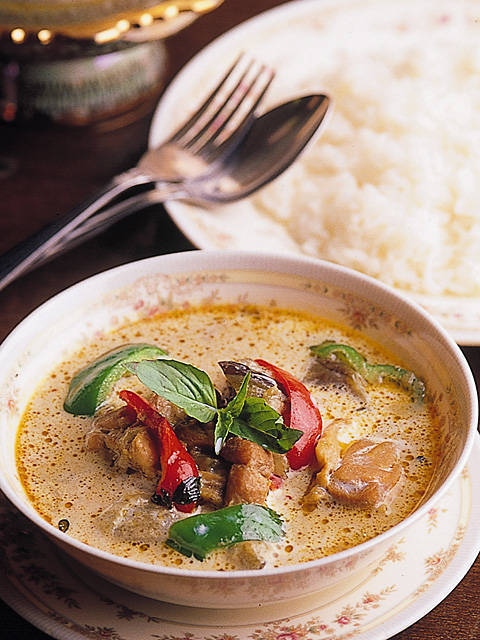 香草をふんだんに使った、辛いながらもさわやかな香りがいきるタイ料理の店。カレーはグリーンとレッドのカレーペーストを独自に調合したクセになる味だ。