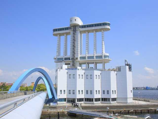 白い帆船をイメージした名古屋港ポートビルは地上53m。売店、レストランや回廊ギャラリー、名古屋海洋博物館を設置し、最上階は港が見渡せる展望室になっている。