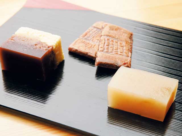 特産である桃をふんだんに使った和菓子が並ぶ。桃羊羹は、発酵させた桃の風味が漂う人気商品。桃をまるごと蜜でつけこんだ夏の菓子、桃酔菓もおすすめ。