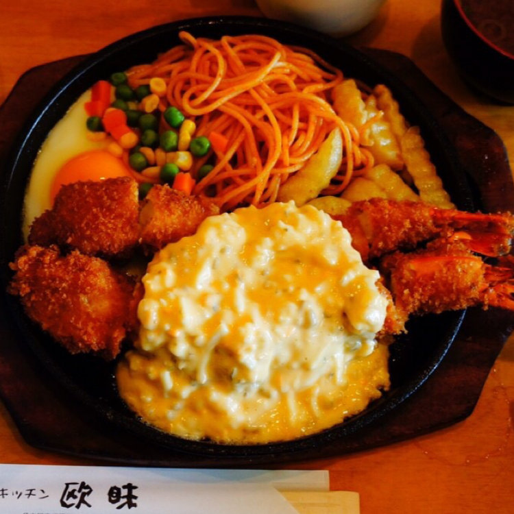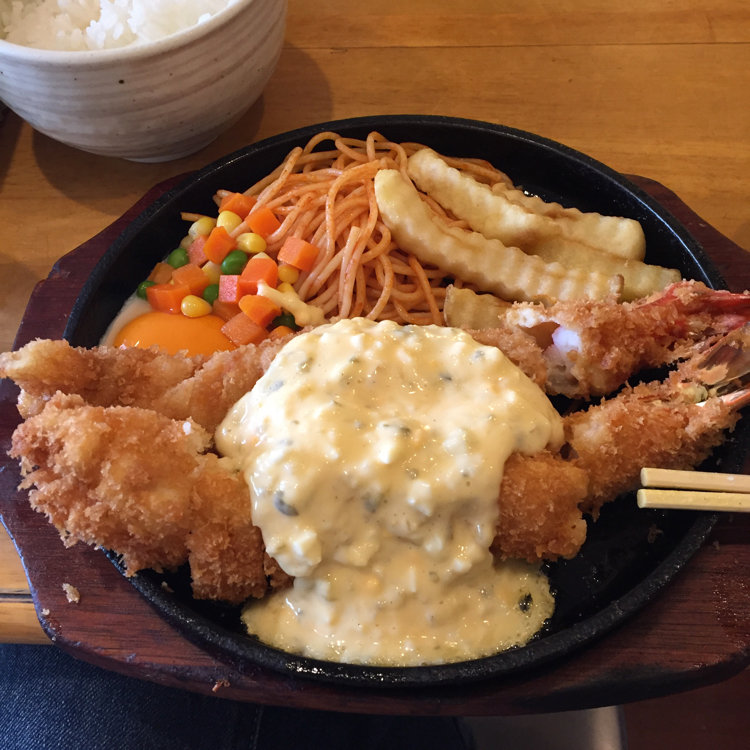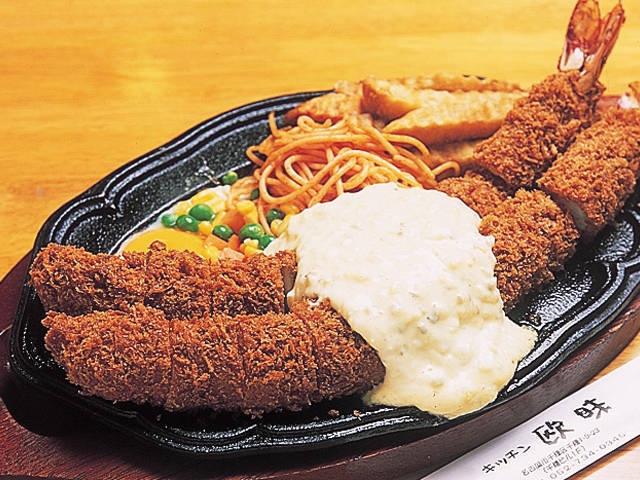 天然ブラックタイガーを使ったジャンボエビフライは約25cm、ジャンボアンドジャンボはなんと30cmもあるビッグサイズ。米は「はつしも」、油は綿実油など食材にこだわっている。