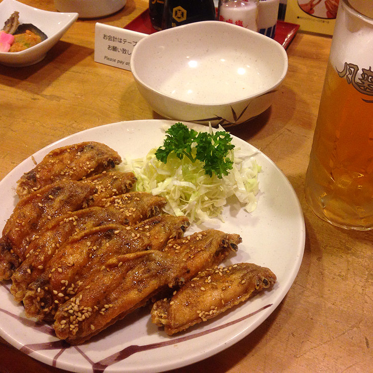 手羽先唐揚げを生んだ仕掛け人と言われるのが、風来坊チェーンの現会長。暖簾分けスタイルで国内外に支店を増やしているが、手羽先は全国共通のタレを使っている。秘伝の甘辛いタレを絡めて白ゴマをトッピングした元祖の味だ。