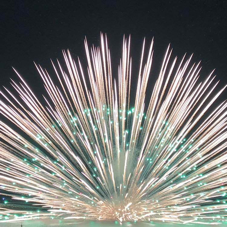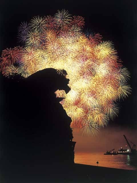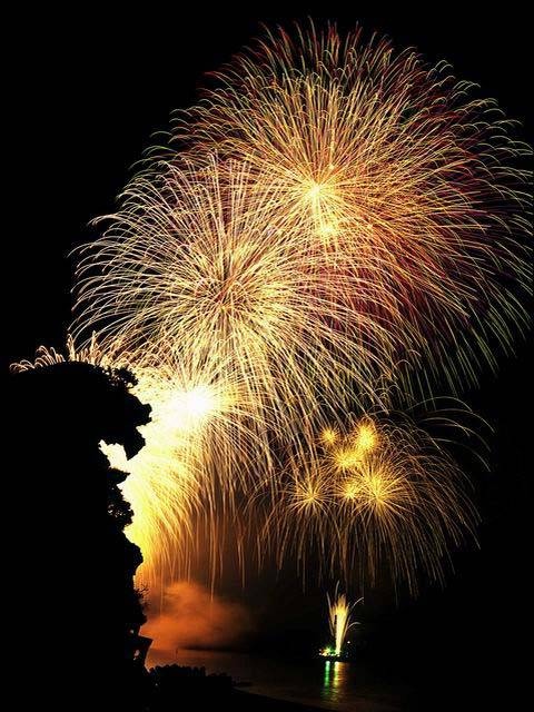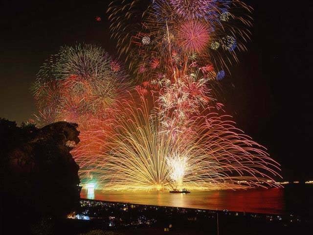 沖合のイカダに三尺玉を仕掛けたり、船から海中に花火玉を投げ入れる「海上自爆」、岩場に仕掛けて大音響を生む「鬼ヶ城大仕掛」など迫力いっぱいの花火大会。