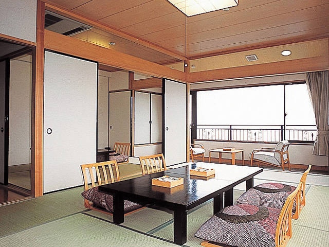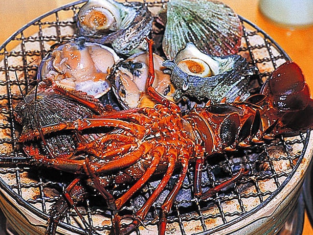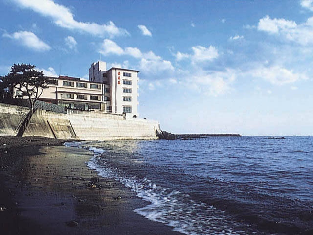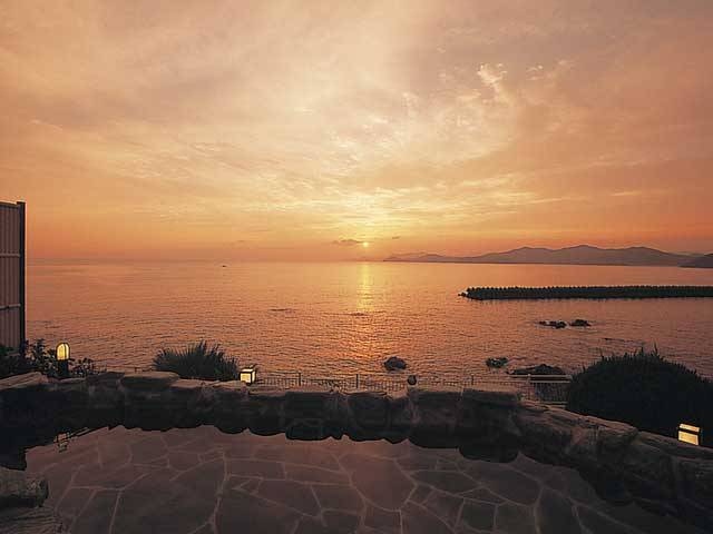 眼下に海水浴場が広がる高台に建つ、見晴らし抜群の温泉旅館。夏は山、冬は海に沈む夕日を楽しめる。獲れたての新鮮な魚介を生きたまま焼く名物料理「残酷焼」も味わい深い。