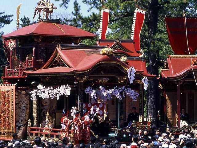 400年以上の伝統のある日本三大山車祭の一つ。動く美術館と呼ばれる絢爛豪華な曳山の上で、華やかな衣裳を着た子どもたちが歌舞伎を演じる。