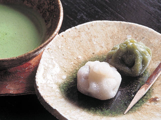 信楽焼の小壺「蹲」の形を模したひと口サイズの銘菓「うずくまる」。茶寮で抹茶といっしょにゆったりと味わえるほか、ぜんざいなどの甘味メニューも好評。
