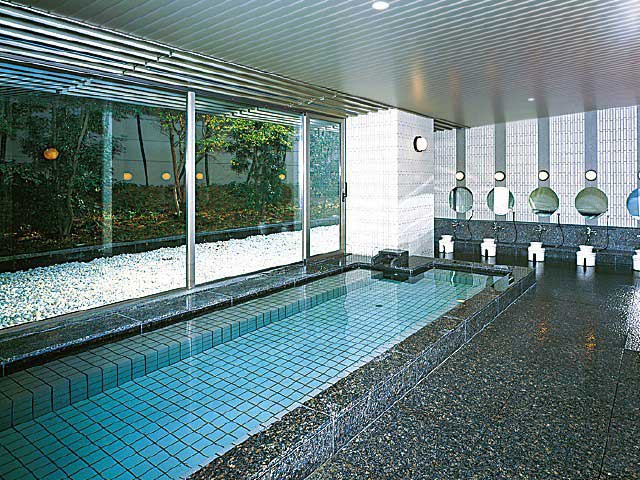 1階ロビー奥に宿泊者専用のガーデン浴場(定員約15名)、手前にはマッサージチェアも置かれた癒しの空間で疲れが取れる。