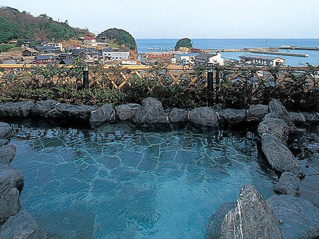 浅茂川漁港を見渡す高台に建つ。海風に吹かれながら露天の岩風呂につかれば、目前に広がるのは日本海のパノラマビュー。ほかに源泉浴槽や温水プールもある。売店には丹後の土産が充実している。