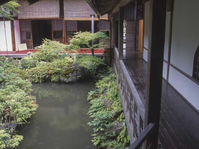 落着きのある外観とは趣を異にする京情緒あふれる中庭には川や滝が流れる“やすらぎ”のホテル