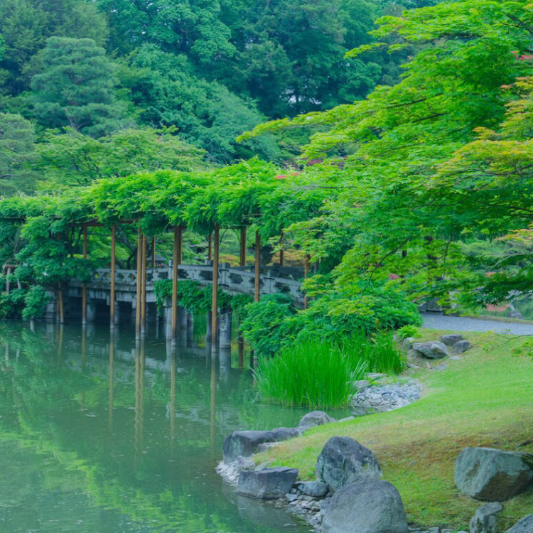 自然と歴史を伝える緑豊かな東山に位置。コンテンポラリージャパニーズをコンセプトにデザインの館内