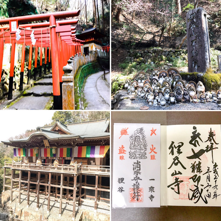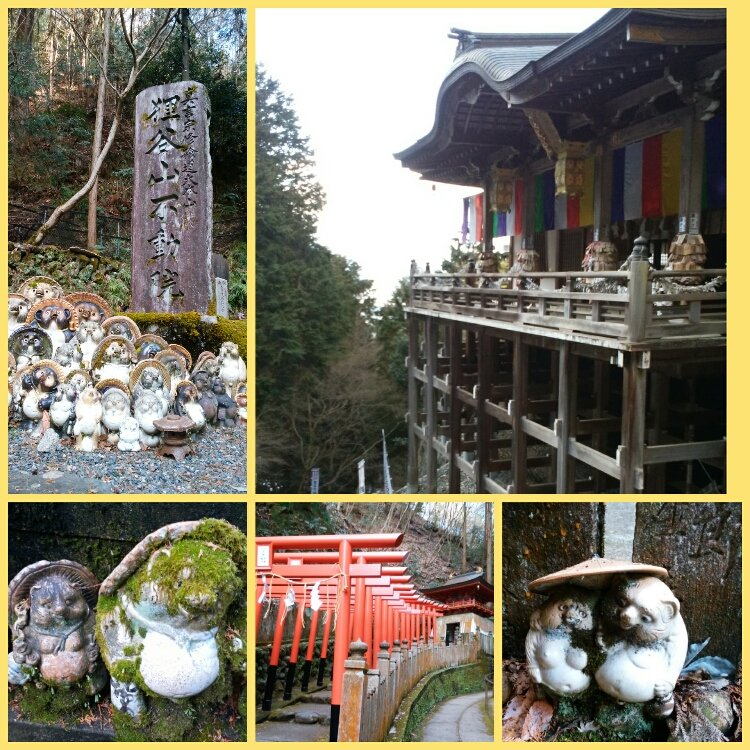 【急に思い立っての京都旅*その4 狸谷山不動院】 詩仙堂右手に、そのまま坂をのぼれば、剣聖・宮本武蔵が立ち寄ったとされる八大神社(一乗寺の氏神として信仰を集める神社)がありますが、更にそのまま進むと、狸谷山不動院へと向かう案内板が目に入ってきます。 こちらは平安京の鬼門守護として、咤怒鬼不動明王を祀ったのが始まり。とても霊験あらたかなお不動様といわれています。 ふっと人家がなくなり、山に入ったと思った地点で、自動車祈祷殿が見えます。(京都の車にはここの交通安全のステッカーがよく貼られています) ここで野生のお猿さんが堂々と歩いていて、ドキンとしながらも、更に上り坂の歩みを進めると、狸山不動院の入口へようやく到着。(トップ写真) おまけ発見ですが、真ん中辺りに阪神タイガース吉田監督の名前もありました。 日本シリーズ、今夜で激戦をもぎ取って王手。 日本一に届くでしょうか。 ここから、気合の250段の階段を登ります。 結構キツいらしいと噂には聞いてましたが、すでに汗だく。 修行の場としての信仰をあつめる古い歴史をもつ土地ゆえ、階段もまさに修行〜。 しかも、顔近くに大きな蝿が飛んできて、もう無理!嫌だ!と思いかけたところ・・・ 1人で心細い道中、もしかすると亡くなった父が心配して、そばで見守ってくれてるのではと感じたら、ほとんど気にならなくなったのです。 むしろ応援してくれてると思ったら、不思議にも覚悟が定まりました。 2枚め:弘法大師像が迎えてくれます 3枚め:最後の大きな階段 4枚め:上がりきったら、本殿の舞台造りの足がドーンと迫って見えます 最近は今が1番若いのだから(笑)で迷ったら、なるべくチャレンジを選びますが、達成感ありまくりでした。 宮本武蔵も、この山の滝で、心の剣を磨いたそうですよ。(10月30日撮影) #私のことりっぷ旅 #秋さんぽ #一乗寺 #狸谷山不動院