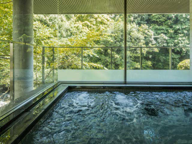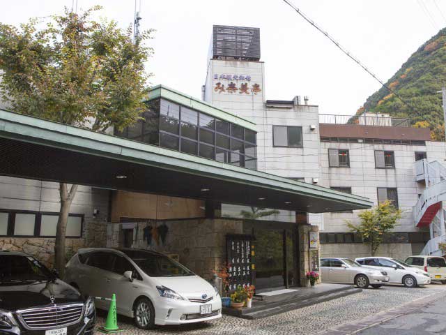 山間の渓流沿いの一軒宿。数寄屋造の本館、天然ラジウム泉の温泉、桜や紅葉が楽しめる三千坪の庭園が自慢。