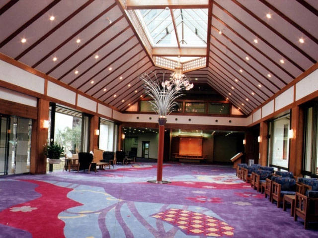 中庭にはかがり火の演出、廊下は畳敷き、ロビーで無料のコーヒー、サウナと水風呂あり。