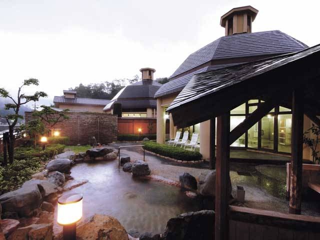 水車のある露天風呂や連なる山並を眺めるサウナなど趣深い浴槽がそろう。源泉は古代花崗岩から湧き出ており、成分は異なるが2種類ともとろりとした重曹泉。宿泊も食事もできる人気の施設。