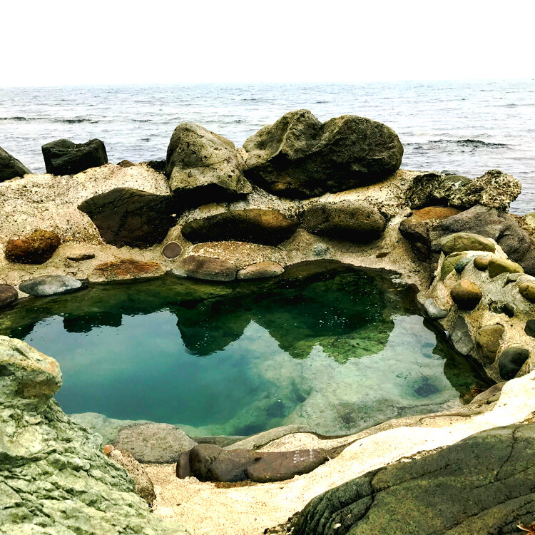 満潮時には海に水没してしまう野趣に富んだ露天風呂。波打ち際に設けられた素朴な浴槽につかれば、海と一体になったような気分。利用の際は管理人に一言あいさつを。