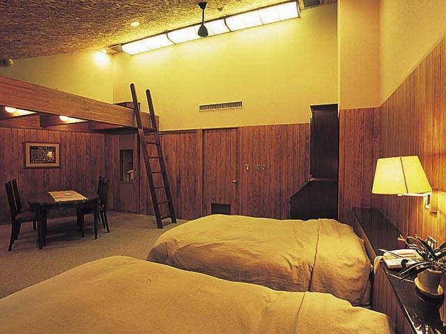 中庭にはかがり火の演出、廊下は畳敷き、ロビーで無料のコーヒー、サウナと水風呂あり。