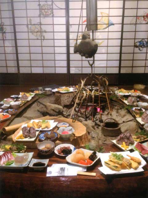 中庭にはかがり火の演出、廊下は畳敷き、ロビーで無料のコーヒー、サウナと水風呂あり。
