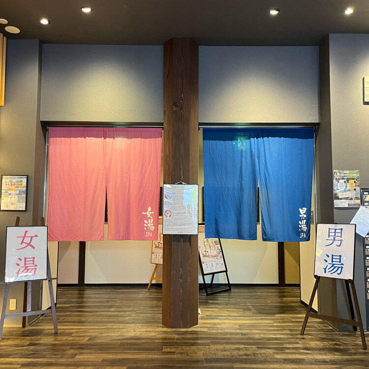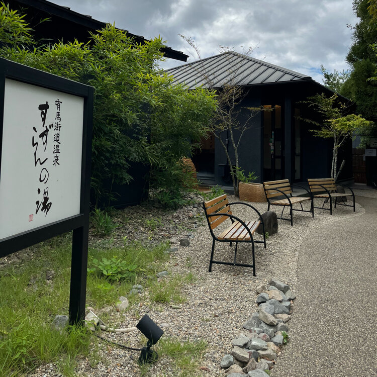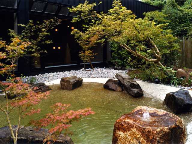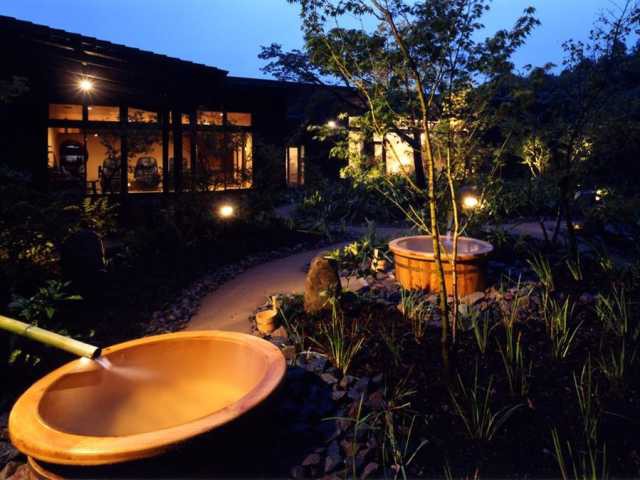 中庭にはかがり火の演出、廊下は畳敷き、ロビーで無料のコーヒー、サウナと水風呂あり。