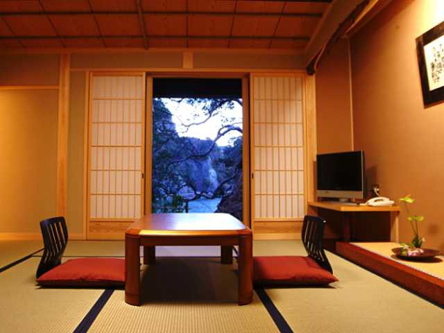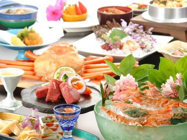 夕日の絶景地、今子浦にたたずむ純和風の湯宿。冬のカニ料理は焼きガニコースから活けガニを使ったコースなど全11プランとぜいたく。土壁や囲炉裏といった昔ながらの造りを生かした空間も魅力。