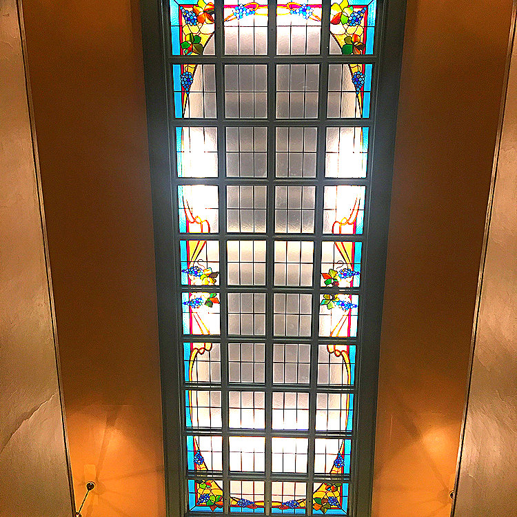 国の登録有形文化財でもある明治44(1911)年竣工のビル。南側玄関を入ると1階から3階まで通じる階段と高い天井、ステンドグラスが印象的。日没からライトアップされる姿も美しい。