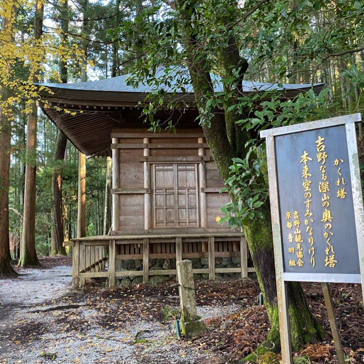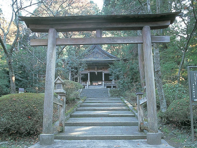 吉野山の地主神を祀り、奥千本に建つ。中世以降は修験道の修行の場となった。境内左手の坂道を下ると、源義経が弁慶らとともに追手から身を隠した「義経隠れ塔」がある。