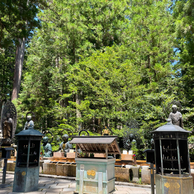 約1200年前の弘仁7(816)年に高野山を開いた弘法大師空海は、その29年後、結跏趺坐のまま奥之院最奥にある、現在の大師御廟に入定。大師は今も御廟所で瞑想しながら救いの手を差しのべていると信じられ、奥之院は弘法大師信仰の中心聖地になっている。一の橋から御廟に至る約2kmの参道は20万基を超えるともいわれる墓碑や供養塔、慰霊碑、祈念碑で埋まっている。