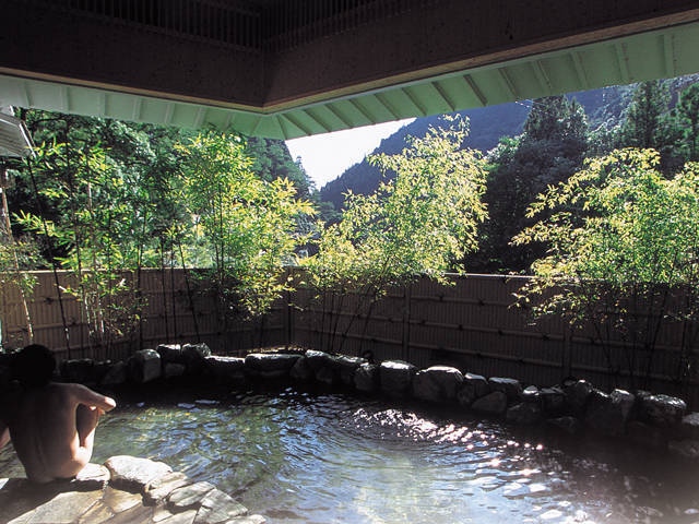 群馬の川中、島根の湯の川と並び、日本三美人の湯と称される龍神温泉の湯元。格調高い和風の建物には檜の内湯と風流な岩造りの露天風呂があり、大きな窓からは深く美しい渓谷を一望。