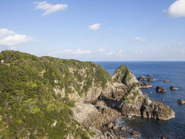 30mもの断崖が続く、太地町南部の海岸線にある景勝地。岬の突端に展望台が設けられていて、西に紀伊大島、東には太地町や那智勝浦町の海岸線が一望できる。