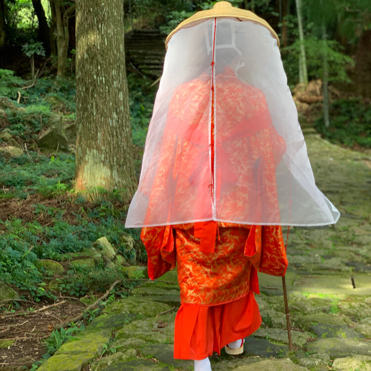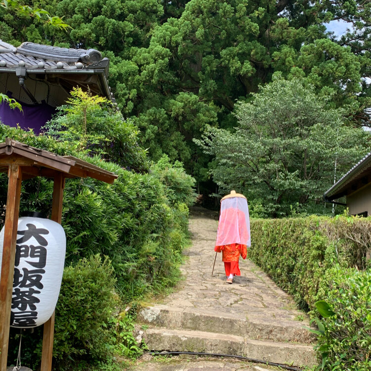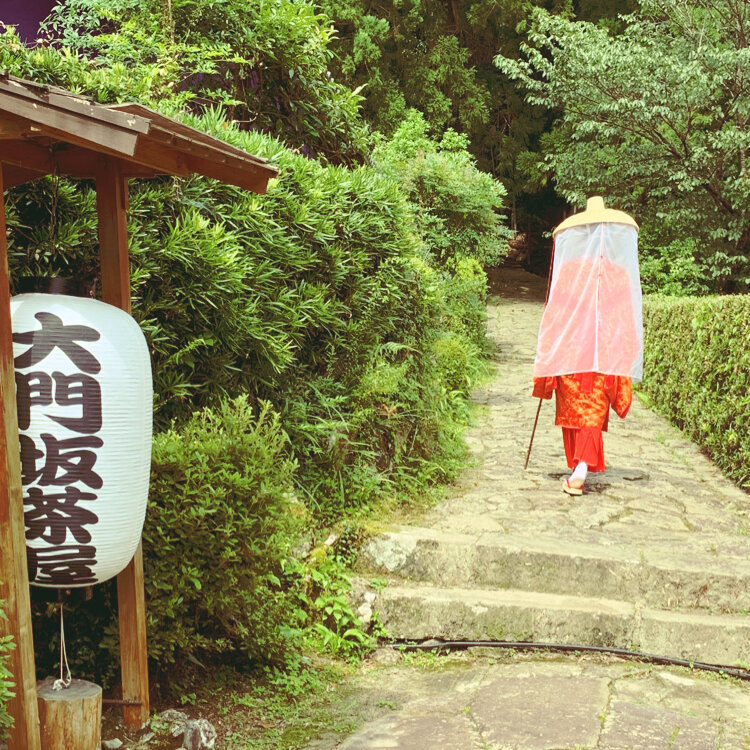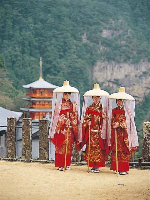 平安時代の絵巻物のような美しい装束をレンタルできる休憩所。装束をまとったまま那智山を散策、写真撮影ができる。衣装は子供用から大人用までサイズが揃う。