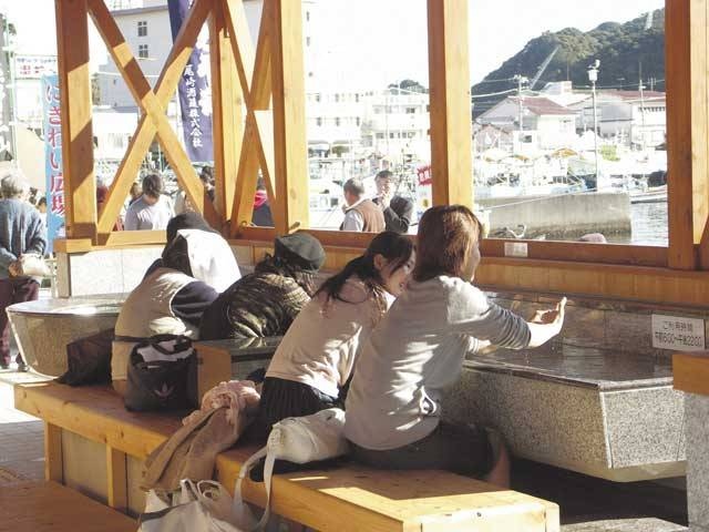 町内で3軒目の足湯。紀州材をふんだんに使った木造の湯屋に、檜のベンチが付いた三つの浴槽とトイレがあり、100%掛け流しで温泉を利用。海に向かって作られているため景色は抜群。