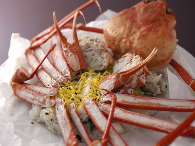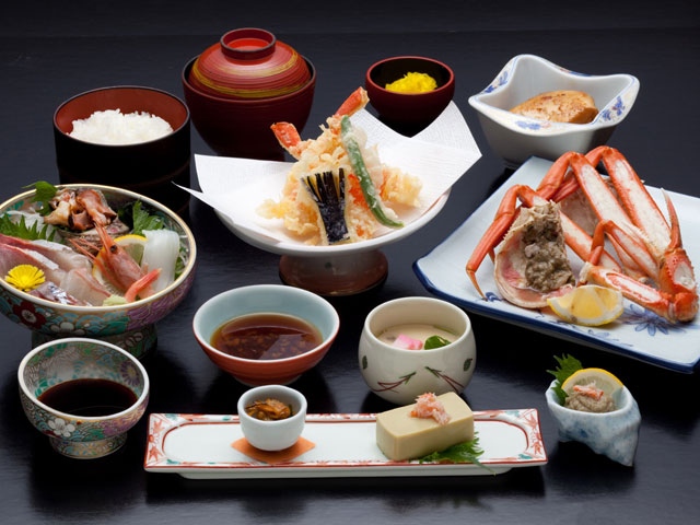 元鮮魚店の店主の目は食材に厳しく、とくに松葉ガニの時期は朝仕入れた新鮮なものでも包丁を入れて質が良くなければ出さないという。カニ以外にも新鮮な魚介料理が味わえる。