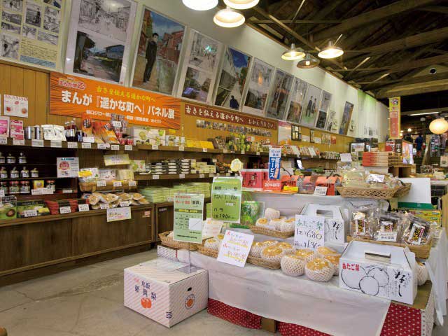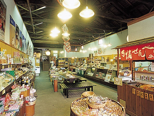 大正時代の醤油の仕込み蔵をリノベートした物産店。倉吉の銘菓をはじめ、地元の漬け物や海産物、郷土玩具、地酒などを幅広く販売。見事な梁を生かした館内の造りにも注目。