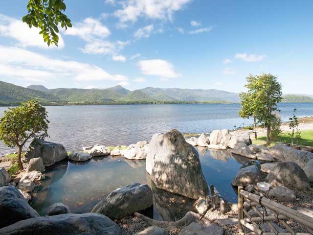 目の前に屈斜路湖が広がる雄大な露天風呂。脱衣所は別々だが、湯船は中央の大きな岩が仕切りの役目をしている半混浴風呂。シーズン中は混みあうので早朝がいい。