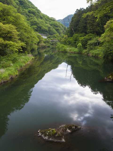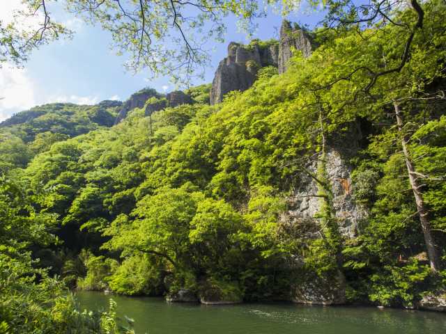 神戸川上流の渓谷。奇岩・柱石が約1km続き、山陰の耶馬渓といわれるところ。渓谷沿いの遊歩道は一周が1時間ほど。途中に吊り橋があり、歩くとゆらゆら揺れてスリリング。