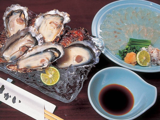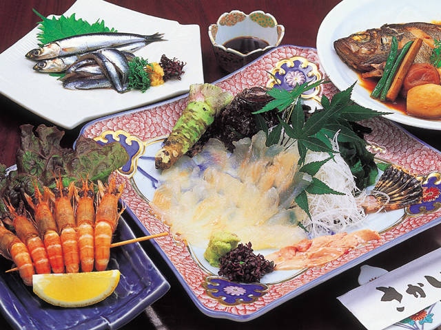 オダギリジョーのコマーシャルが撮影された料亭旅館。透明で爽やかな甘みのオコゼの薄造りは極上の味。