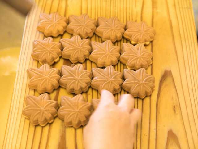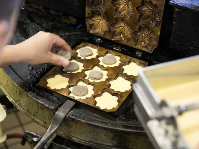 自動化された製造機を使わず、ひとつひとつ手作りを守るもみじまんじゅうの店。チーズもみじまんじゅうが人気。バニラ、抹茶、ストロベリーなどのアイスクリームを詰めたアイスもみじも好評だ。