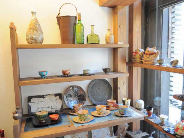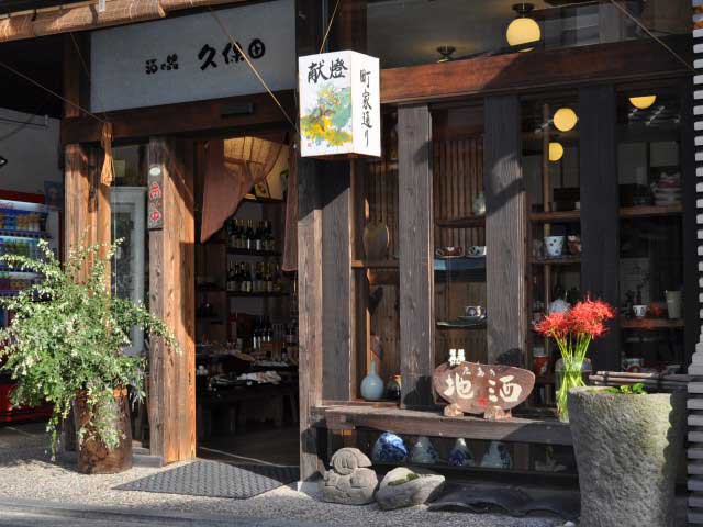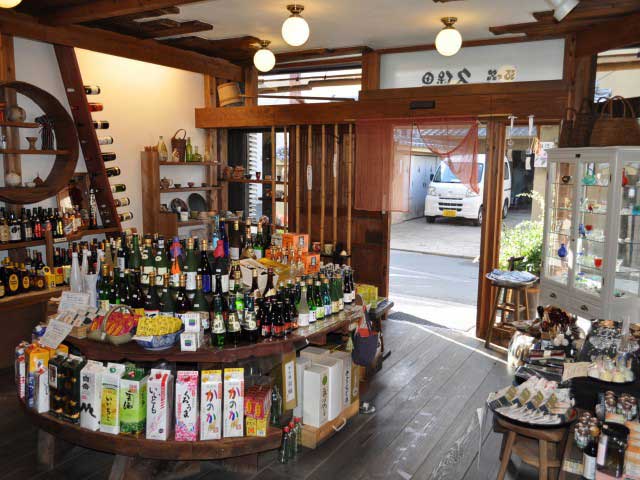 賀茂鶴、宝寿など約30~40銘柄の地酒や焼酎を扱う酒屋。銘酒として名高い「龍勢」は店内で試飲できる(おちょこ1杯100円)。器をはじめ、酒に関するおみやげや雑貨なども販売。