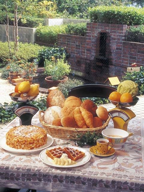 建物は洋館風のタイル張り。朝食の焼きたてパンが人気
