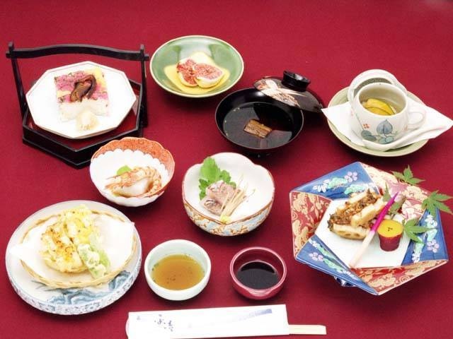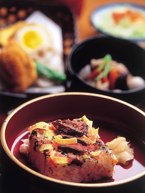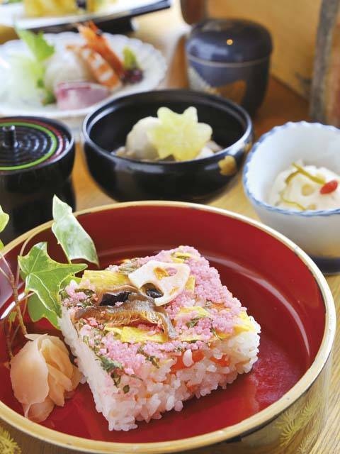 目の前に錦帯橋が架かる、古い町家をモダンに改装した和食店。彩り鮮やかな岩国寿司、野菜を薄味で吸い物風に仕上げたおおひらなどの伝統料理が入ったじゃのめご膳が人気。
