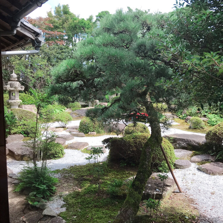 広大な枯山水の庭を眺める