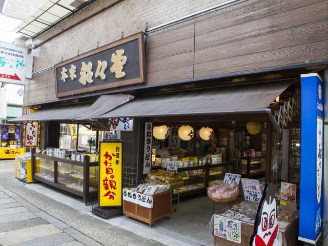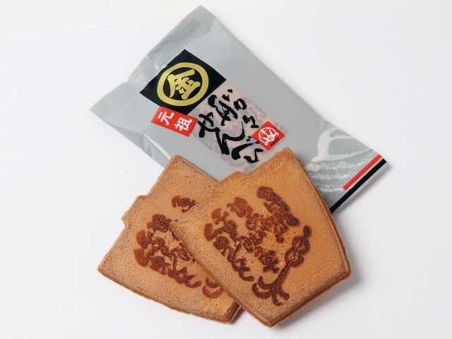 「こんぴら船々・・・」の民謡で知られる、こんぴら船をかたどったせんべい。せんべい、店名ともに民謡に由来し、明治期の発売以来、こんぴら参りみやげとして人気。