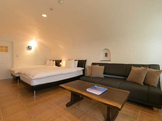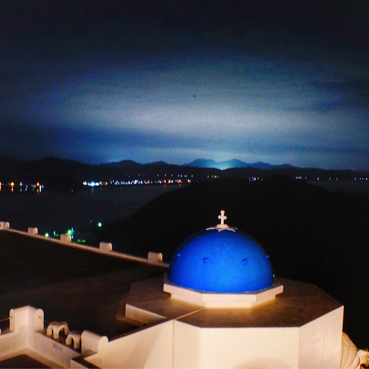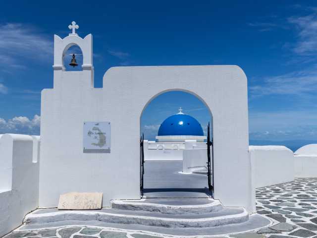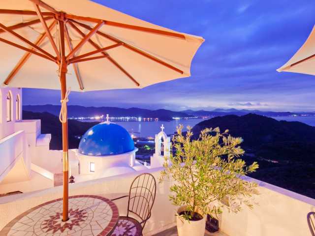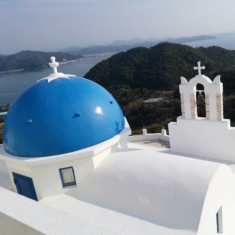青いドームや白いベルタワー、日本であることを忘れてしまいそうなサントリーニ島をイメージしたホテルです