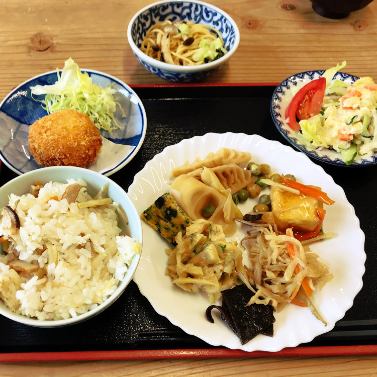 地元住民がグループで営む農家レストラン。地域の野菜を中心に川エビや鮎、イノシシなど季節の食材を使うため、献立が決まるのは当日の朝。バイキングスタイルで10種類以上の料理が楽しめる。