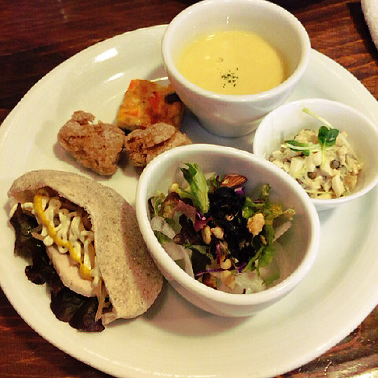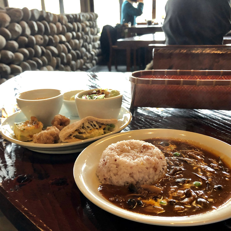 【cafe たねの隣り】#うきはさんぽ ② 関東からのユーザーさんとのデートは うきはへドライブ❣️ うきは地方は葡萄(主に巨峰🍇)の産地と言うこともあって、ここは「葡萄家」という名前の付いた人気のお店です。 「たねの隣り」は、その敷地内にあります。 以前の「葡萄家」はコース料理と雑貨のお店、そして別棟でカフェがありましたが、カフェの人気がとても凄く、いつの間にかコース料理のお店がなくなり、「葡萄家」は美味しいおやつ屋さんに変わり、もうひとつ「坂の下」というカフェが出来ました(坂の下も素敵なところです) 。 行列の出来る「たねの隣り」で、運よく並ばずに入れた私たちは、店内を見渡せる素敵な場所へと案内していただき、時間を忘れそうになるくらい、のんびりと過ごしてきました。 いただいたのは、地元産の旬の野菜をたっぷり使った和定食「隣のごはん」😋🍴 今月のメインは「れんこん団子のあんかけ」 以前も食べたことのある、れんこん団子の味が美味しくて忘れられなくて、また注文。 他には、芋いもサラダ、「ぶどうのたね」オリジナルの酒粕グラノーラの入った季節のサラダ、けんちん汁、麻婆大根、魚のピーナッツバター煮、柿とかぶのマリネ、オムレツ、大豆の唐揚げ、金山寺納豆、豆乳豆腐、鉄火味噌、十三穀米、味噌汁、漬物。 食材にこだわり、調理法にこだわった料理は絶品です。 美味しくて居心地のいい場所、また行きたいと思える場所。 行列が出来るのも納得です。 #わたしの街#ことりっぷ福岡#ユーザーさんと行くうきはさんぽ
