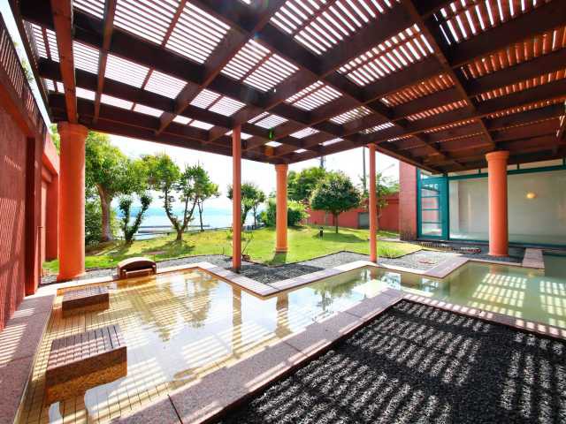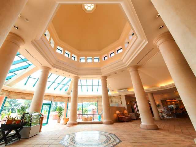地中海風リゾートホテルで非日常的な空間が醸し出す独特の安らぎが味わえる。海が見える露天風呂、サウナ、女性専用の大理石風呂がある。夕食は和洋創作ディナー。プランによりレストラン内の専用個室で食事が楽しめる。