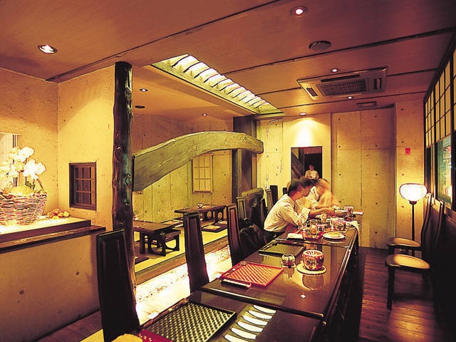 中島川沿いに建つビル内の茶屋。午後3時30分までは和のスイーツが味わえる和風カフェ、夜は日本酒やワイン、カクテルなどを楽しむことができる「酒肴バー 花ござ」として営業。