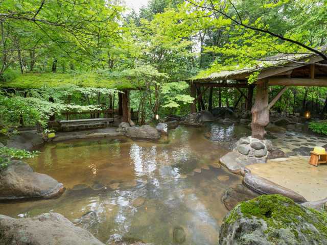 約10000坪の広大な敷地に、16室の全室温泉付き離れ。BGMは川のせせらぎと鳥のさえずり