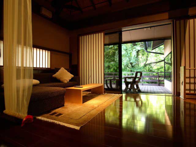 三千坪の広大な敷地にある一日3組限定離れの客室。“大人の隠れ家”で心ゆくまで源泉かけ流しをご堪能。